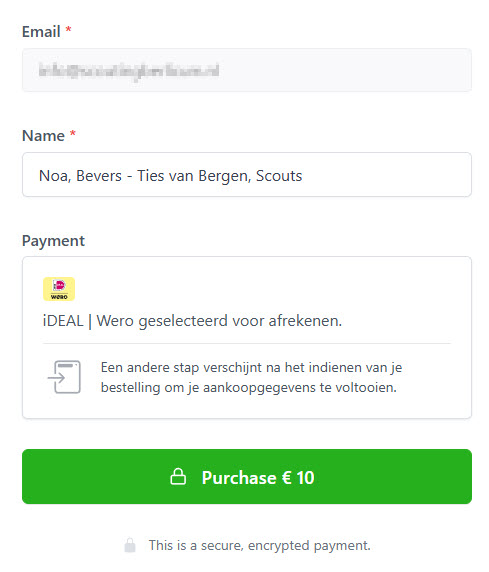 Voer bij afrekenen de naam van uw kind en speltak in!